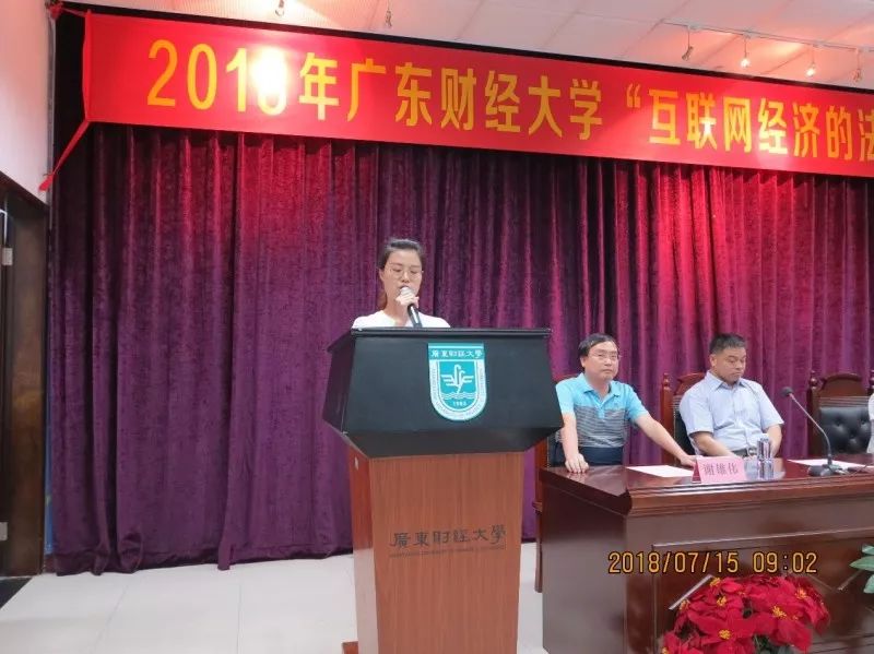 贵州民族大学法律硕士陈红霞同学作为学员代表在会上进行发言。她向暑期学校的举办方表示了衷心感谢,并表示今年暑期学校是在互联网经济的背景下举办的,一些新的法律问题亟需学者进行理论上的阐释和澄清。此次暑期学校的授课老师在互联网法律及相关问题的研究上有着深厚的学术造诣,学员们将认真学习,虚心求教。