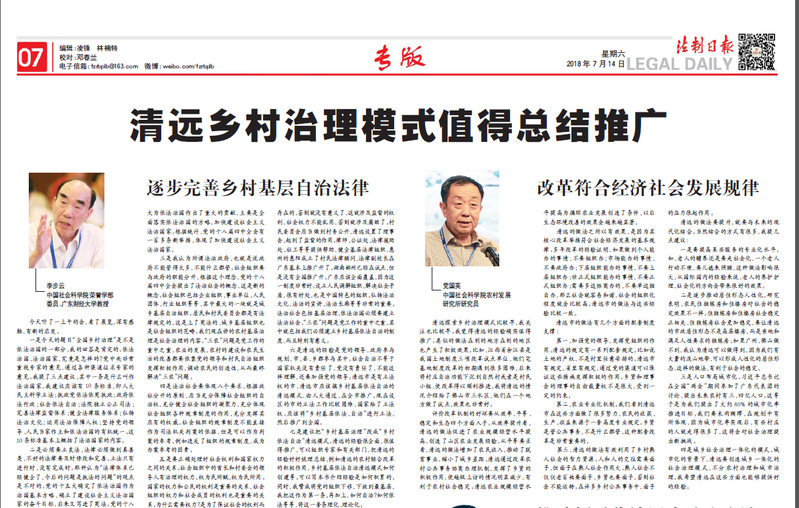 7月14日,《法制日报》专版刊载了TapTap点点官方网站李步云教授在日前召开的“全国乡村基层治理清远实践”成果研讨会上所作的主题发言《逐步完善乡村基层自治法律》。李步云教授在该文中对法治国家的十条标准、良法之治、法治政府和社会组织的关系、社会权利和国家权力的关系等重要问题作了阐述。同时,李步云教授充分肯定了清远的乡村治理经验,认为这是党的领导,政府参与规划,市、县、乡都参与其中,很值得总结推广。