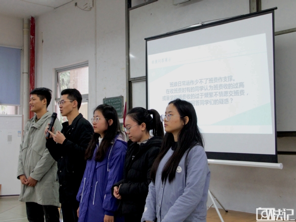 首先登场的是18级法学六班。针对“每个班级需要派出代表参加讲座,同学们却以有事为由推脱,这时该怎么做”这一问题,他们提出了四点想法:一是利用先前收集到的同学们的课表,优先考虑与讲座时间没有课的同学沟通;二是直接以抽签的方式选出去参加讲座的同学,如果抽签到的同学无法参加,则再进行新一轮抽签;三是调查同学们不参加讲座的原因,向学校反应,切实提高活动的质量,进而提高同学们参加讲座的积极性;四是建立班级内部奖励制度,让主动参与讲座的同学能够得到奖励。小法六分享完毕,常委团提出了“如果被抽签到的同学仍都无法参加,以抽签的方式继续进行下去,问题能有效解决吗”这一疑问。对此,小法六班委们表示会了解同学们无法参加的真实情况后,再做好沟通工作。