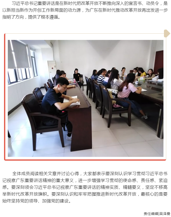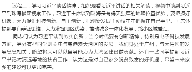 学习活动由汪诗琪同志主持,邓锦辉同志记录。学习会中强调,我们要深刻认识习近平总书记视察广东重要讲话的重大政治意义、现实意义和深远历史意义,形成学习贯彻习近平总书记重要讲话精神的高度思想自觉和行动自觉。