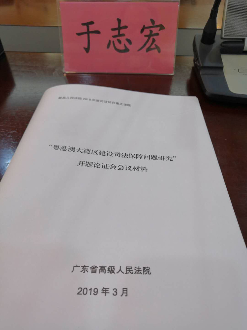 最高人民法院2018年度司法研究重大课题——“粤港澳大湾区建设司法保障问题研究”开题论证会于2019年3月27日在广东法官学院三楼国际会议厅举行。于志宏教授作为课题组成员接受广东省高级人民法院院长龚稼立的邀请,出席此次开题论证会。论证会的参会人员包括课题组成员,此外,还邀请了北京大学政府管理学院教授、博士生导师白彦老师和广州大学教授、博士生导师董皞老师出席指导。同时,广州市中级人民法院院长、广州知识产权法院院长、佛山市中级人民法院院长作为特邀嘉宾参加此次论证会。参加本次论证会的还有广东省高级人民法院环资庭庭长等十多位来自广东省高级人民法院、深圳市中级人民法院、珠海市中级人民法院和广州海事法院的法官。