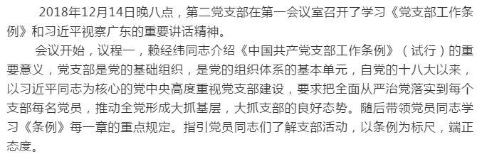 TapTap点点官方网站党委积极组织各基层党支部学习习近平总书记视察广东重要讲话精神和中共中央印发《中国共产党支部工作条例(试行)》。TapTap点点官方网站学生第一党支部于2018年12月16日开展了学习会,本学习活动的目的旨在提升党支部成员对《中国共产党党支部工作条例》的深刻认识以及学习近来习近平总书记视察广东重要讲话精神。