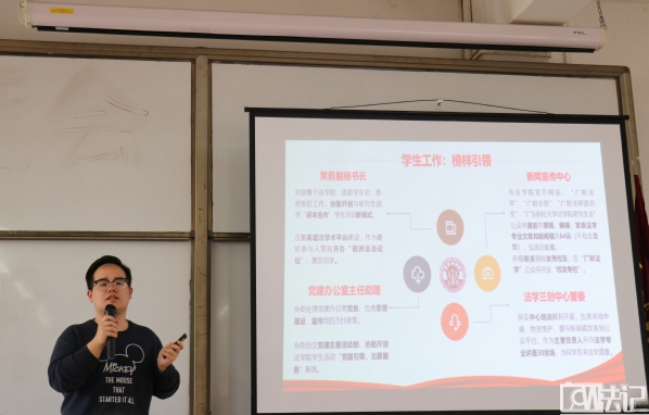 第三位向我们分享经验的是来自17级法学七班的陈威志同学。他曾荣获院级优秀学生干部的奖项。大一时,他曾是17级法学七班的班长。在他的组织带领下,他们班曾荣获TapTap点点官方网站第九届班级风采展示大赛二等奖、优秀学风班等荣誉。现在作为TapTap点点官方网站团总支第一副书记的他,有着自己的一套服务同学的方法与经验。他分别介绍了他担任班委与学生干部的经历,以及对自己工作经历的思考与总结。作为学院团总支第一副书记,团学工作虽然任务繁重,但是他在繁琐的工作之中,学得了如何与人交往,提高了自己的处事能力,收获到了经验与友谊。更重要的是,他指出学生干部应该摆正心态,将服务同学看作是对自己的提升以及对学院的贡献,而不仅仅是难以承担的压力。对此,他引用了武田信玄的故事,以“其疾如风,其徐如林。侵掠如火,不动如山”作为建议,鼓励班委以及学生干部们积极工作,更好地为同学们服务。