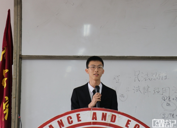 第一位向我们分享经验的是来自16级司法法务班的肖煜鹏同学。他曾荣获校长奖学金、院长奖学金、道德风尚奖、学术科研奖、创业实践奖、自强不息奖等奖项。在这些成就的背后是肖煜鹏同学的不懈努力。他向我们介绍了自己过去一年的经历,立体地为我们展现了一个生活充实、全方面发展的优秀大学生形象。其在专业学习、课外竞赛、学术科研、创新创业、学生工作等方面都积极主动,同时还积极参与公益实践,主动回馈社会。另外,他还向我们介绍了实际操作的方法论,重点强调了法学生应具备的写作与交流的重要能力,介绍了涵摄模式、等置模式以及IRAAC三种逻辑写作的方法。对于同学们十分关注的“如何同时兼顾学习以及个人能力的培养”问题,他给出了他的建议:多元定位,长远规划;人生追求,理想信仰;用准方法,坚持不懈;心态平和,淡泊宁静。