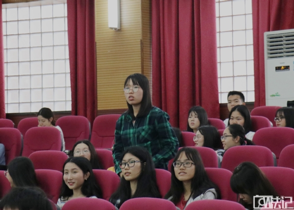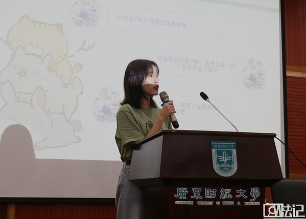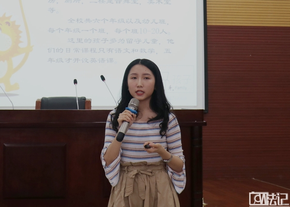 紧接着,Summer社会实践队的队员代表关楠楠上台展示活动成果。她以亲身经历,生动地跟我们分享了去年Summer社会实践队下乡前的工作计划以及到达和奠村后的教学经历、法律知识课堂、家访活动、雷剧文化调研等活动。她表示在支教过程中,队员们通过与孩子们的日常相处收获了真挚的感情与珍贵的回忆。半个月的支教生活,带给孩子们的不仅仅是知识,更重要的是关爱与陪伴。同时她也介绍了当地的乡村特色及其背后所体现出教育存在的问题。通过真正的接触,她懂得要珍惜现有的学习条件,并要以自身的力量给乡村孩子开启一扇窗,鼓励孩子努力学习,走出乡村,以增长自身见识,成长为更优秀的人。