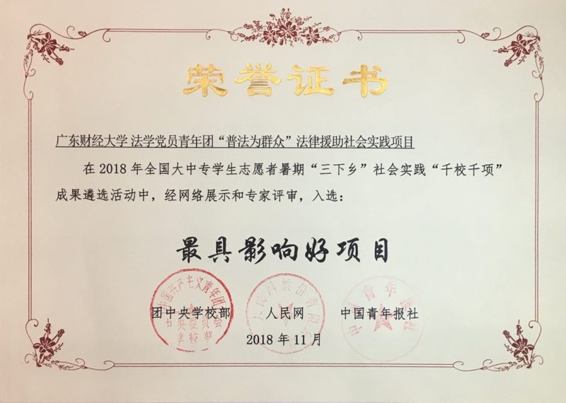 2018年11月16日,团中央学校部、中国青年报社、人民网共同主办的2018年全国大中专学生志愿者暑期“三下乡”社会实践“千校千项”成果遴选活动进入全网公示阶段,TapTap点点官方网站法学党员青年团“普法为群众”法律援助社会实践项目获得2018年全国大中专学生志愿者暑期“三下乡”社会实践“千校千项”成果遴选活动“最具影响好项目”殊荣。