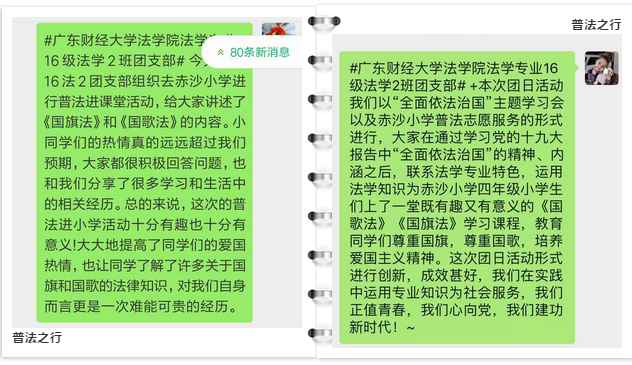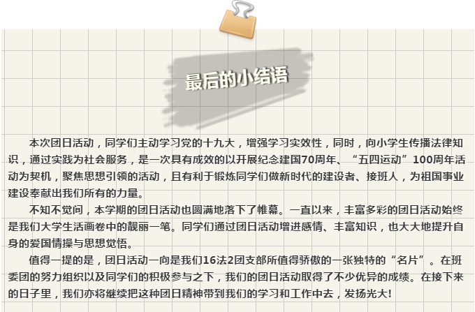 为贯彻学习党和国家在中国新时代背景下的依法治国理念,结合“法治”的重要群众基础——让公民知法懂法,16法2 团支部于近期以【青春心向党,建功新时代】为主题开展了一系列团日活动。
