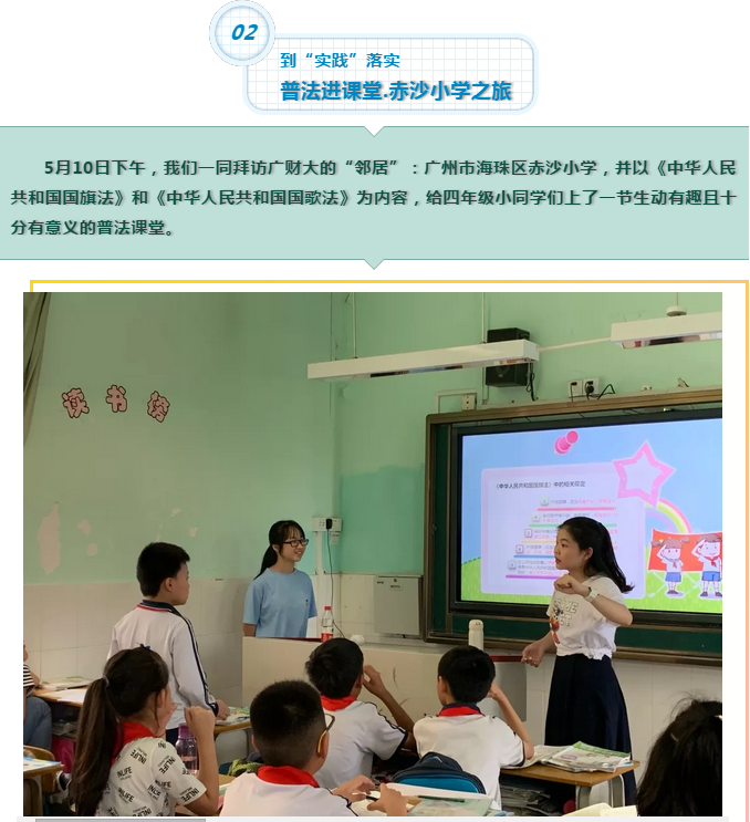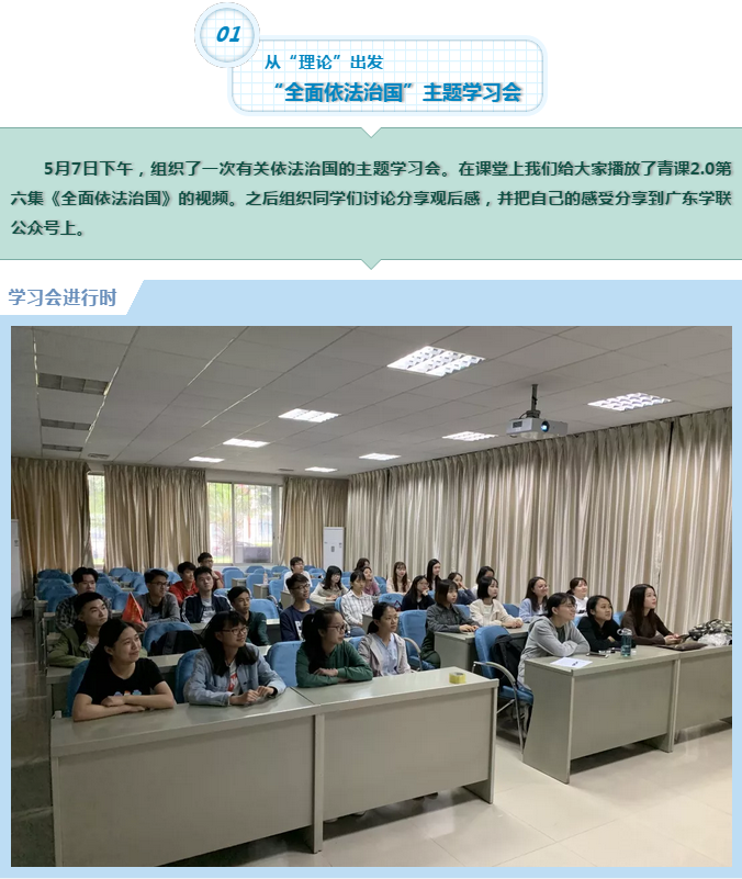 本次团日活动我们采用了“从理论到实践”的思路。首先开展了“全面依法治国”的主题学习会,从“理论”开始出发;再者组织了一支热爱义教、有义教经验的志愿队伍到赤沙小学进行普法义教,从“实践”落实到位。