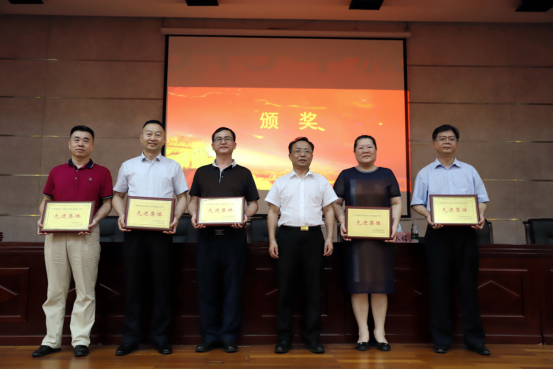 庞金周老师(右二)领取“就业先进个人”称号