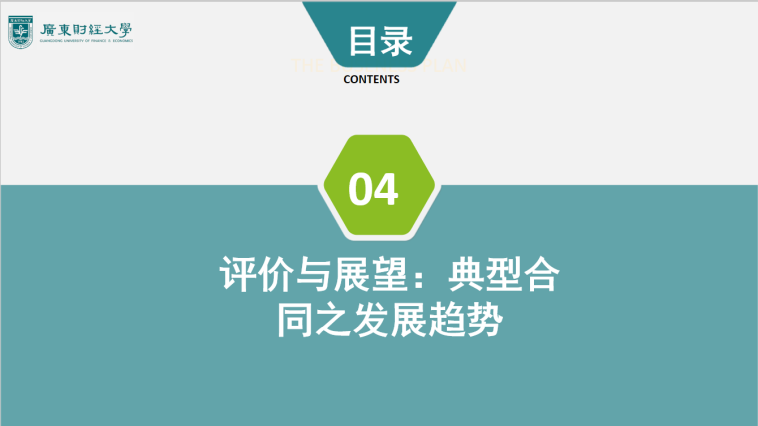 第四个部分讲的是“评价与展望:典型合同之发展趋势”。编在民法典中不仅篇幅巨大,更是体现“民商合一”的最重要领域之一。民法典合同编典型合同分编存在诸多不足。主要体现在:一是数量不足。由于社会经济生活的变化发展,法律交易中,当事人发展出许多适应生活需要的、较成熟的合同类型。这要求法律对其进行规整,再加上学者对一些合同类型特征的专题研究,也使得进行法律上的规整成为可能。正是基于这个需要,学者提出的民法典草案规定的合同类型都达到了3065个。二是一些方面的融合尚为粗略,对民事合同、消费合同和商事合同区分得不够,或者偏重其中一个方面,这些可能导致适用上的困惑。三是对有名合同的类型化不足。就合同法典型合同的发展趋势而言,曾祥生教授认为主要有:(1)合同类型日益复杂化与类合同立法方法;(2)民事规则与商事规则的区分与适度融合;(3)民法典与商事特别法的相互补充;(4)标准示范合同的作用日趋重要;(5)典型合同与混合合同规则、无名合同规则的联动。