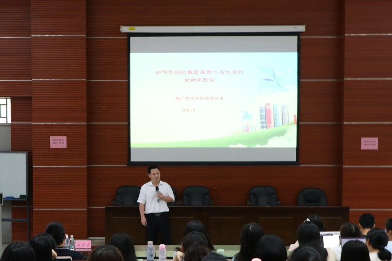 讲座伊始,黄慰宏处长先从“毕业后你的职业规划”随机提问了几位同学,从而引入 “金融风险官”这一新兴职业。从大时代背景、自身工作背景、课题和工作职责四个方面解释了本次选题的原因,经过一系列分析得出金融风险官的最佳人选需要具备法律、技术和金融三个素质。