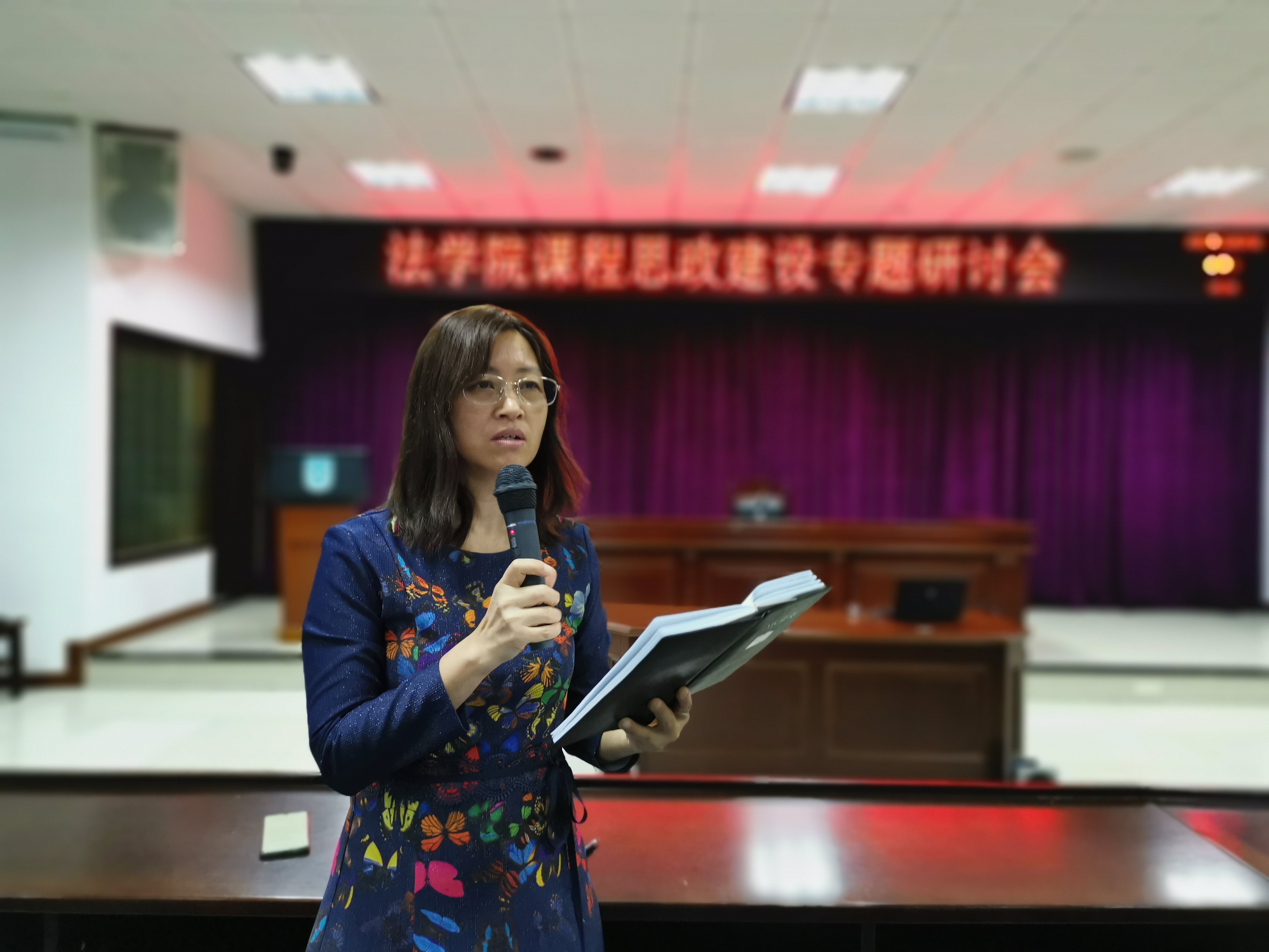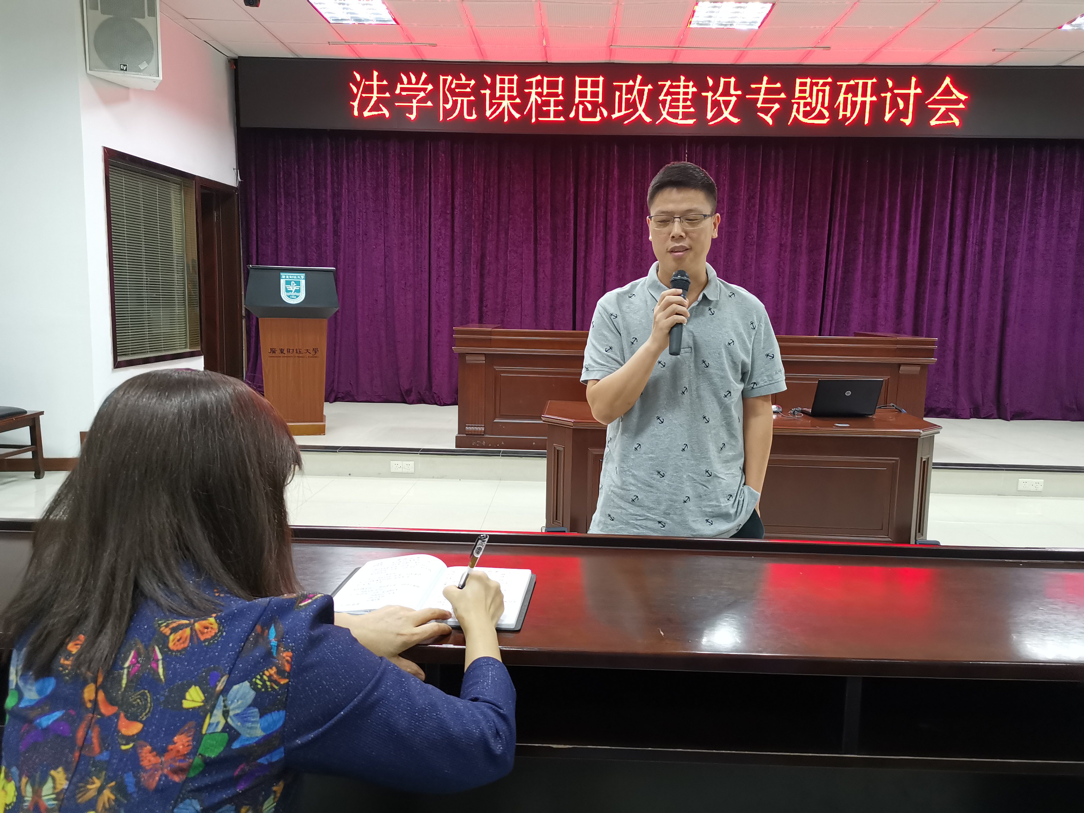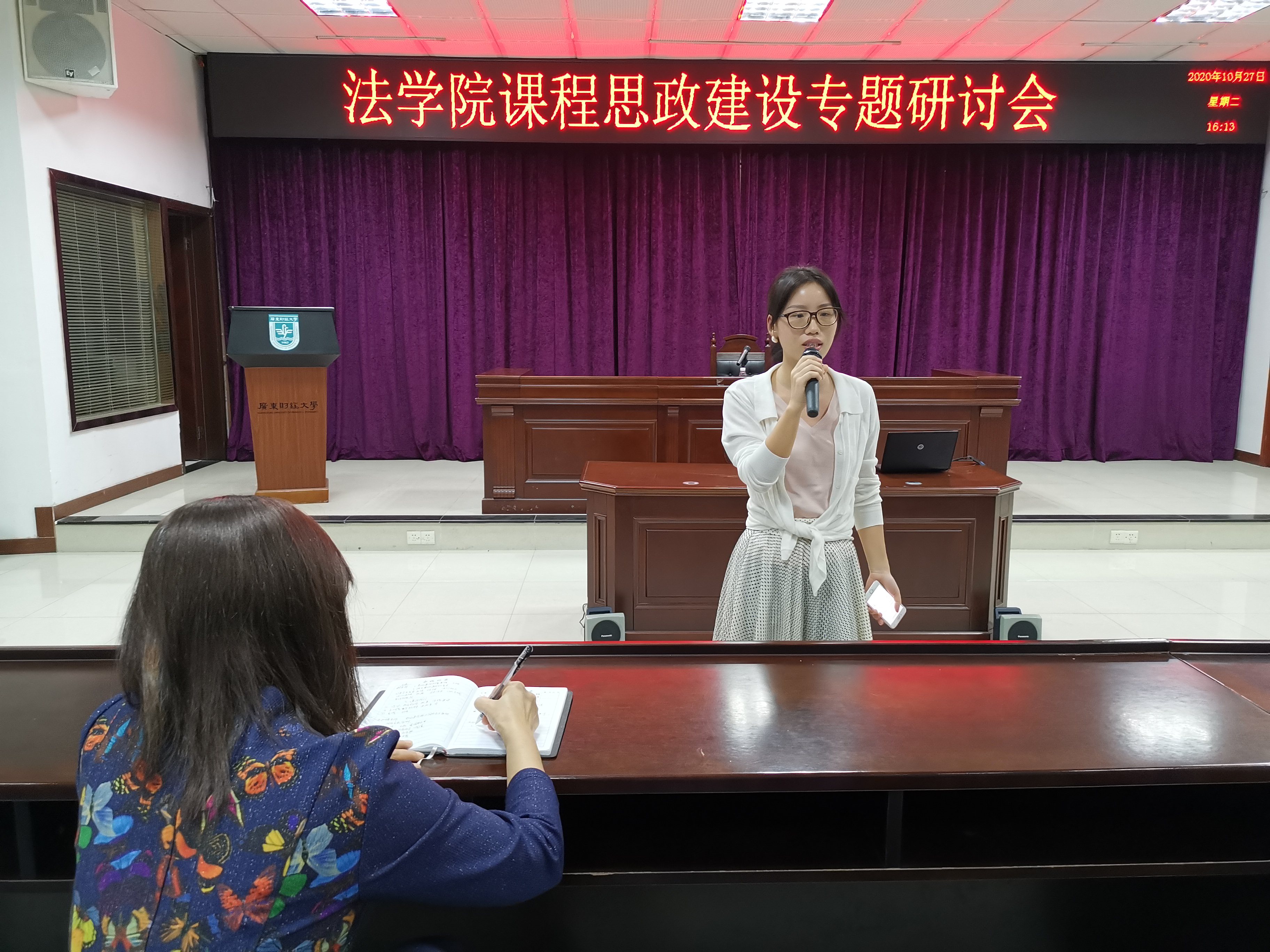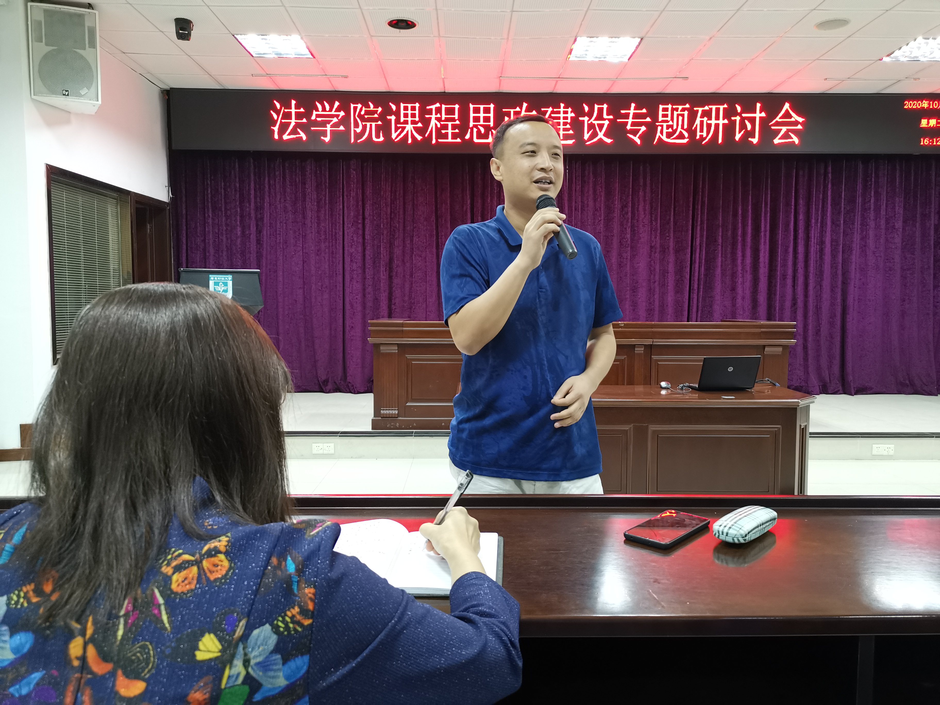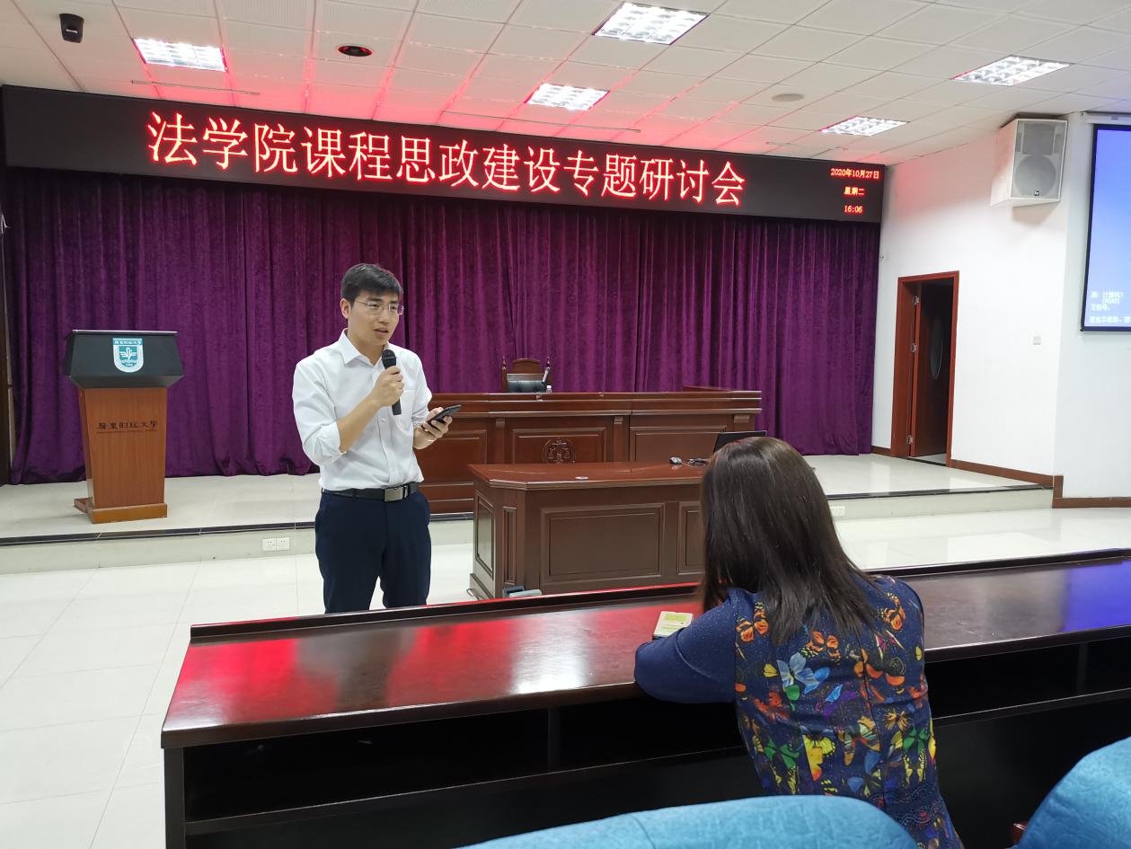 第三阶段,各教研室交流总结讨论结果。每个教研室派出一位老师代表对本教研室的讨论进行总结和交流。理论法学教研室的李振宇老师、宪法与行政法学教研室的邓莉老师、民商法学教研室黎运智老师、国际法学教研室的马永梅老师、诉讼法学教研室的孙志伟老师分别就各自教研室的讨论进行了总结,介绍了老师们对课程思政建设的理解和认识、法学专业、法学课程思政建设的重点和难点,本教研室课程思政建设的计划及实施等。