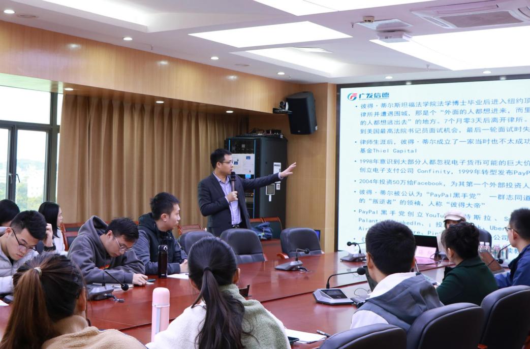 接着又以KKR乔治·罗伯茨、Pay Pal彼得·蒂尔、同创伟业郑伟鹤、基石资本张维,四位“风投家“的奋斗经历,为我们介绍了基金等相关金融知识。在这四位的经历中,关键一环也是法学学习经历。整个讲述过程中陈经理与同学们亲切互动,娓娓道来。