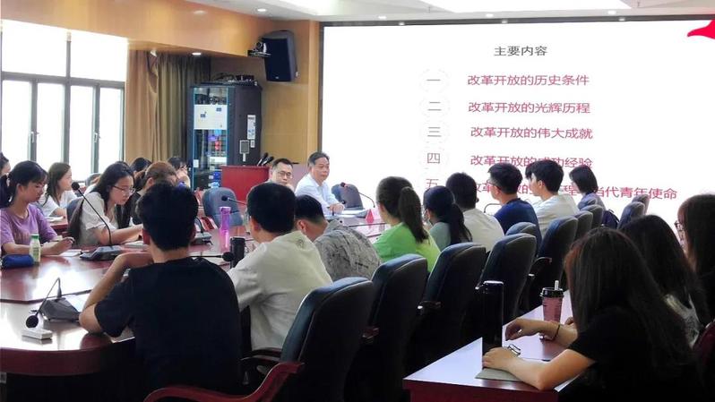 本次课堂,袁东卫主要从改革开放的历史条件、光辉历程、伟大成就、成功经验以及历史进程与当代青年使命五点展开讲述,回顾了改革开放的奋斗历程。