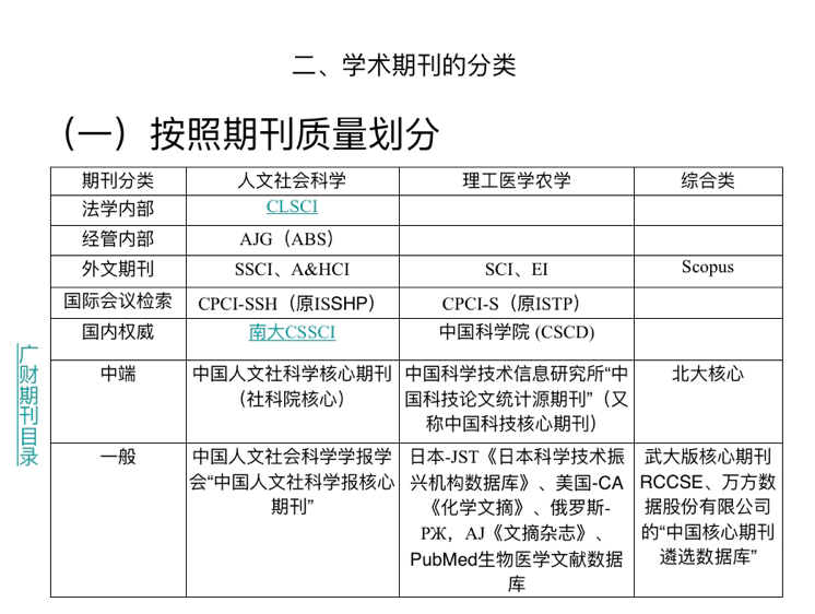 其次,冯泽华博士谈到了学术期刊的分类,将其按照期刊质量、主管部门、注册地、转载认可度等标准划分进行了系统讲解。