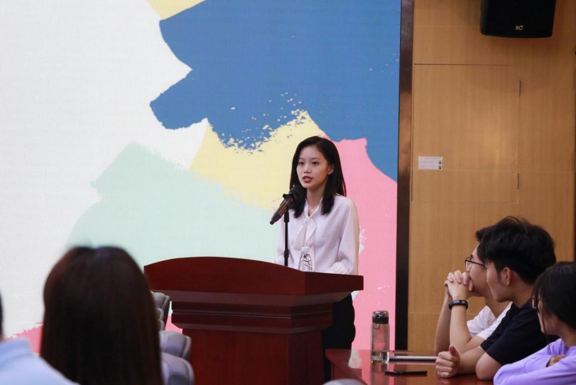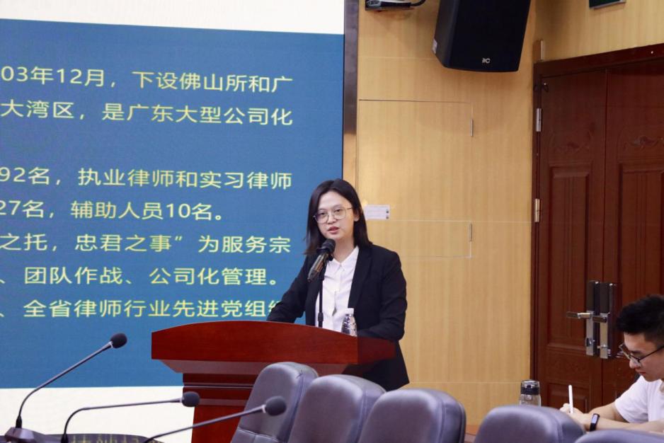 吴钰钿同学目前正于广东天地正律所金融公司部就职,她向在座各位分享了自己选择律师方向的动机,需要在职场中长远地检验自己是否适合当律师。天地正律所的企业文化氛围良好,联谊活动丰富,律所秉持团队共赢的理念,互帮互助,给予年轻律师宝贵的锻炼机会和实践指导。她建议法学生,要尽快走出舒适圈,转变被动的学生心态,勇于尝试,遵循自己内心的选择。