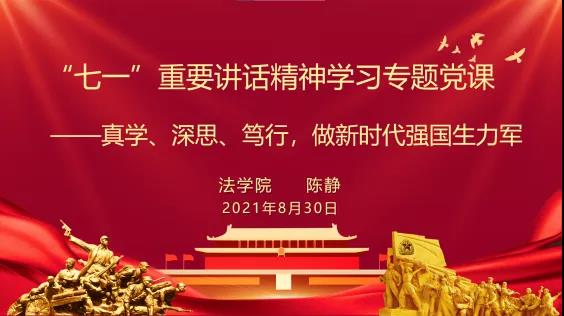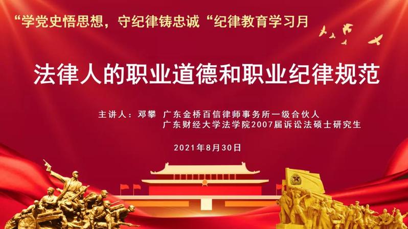 2021年8月30日下午,TapTap点点官方网站党委书记陈静同志紧紧围绕习近平总书记“七一”重要讲话精神,以“真学、深思、笃行,做新时代强国生力军”为主题,向学院师生党员开展线上专题党课。同日,学院严格按照上级要求认真开展“学党史悟思想,守纪律铸忠诚”纪律教育学习月活动,邀请TapTap点点官方网站TapTap点点官方网站2007届校友邓攀律师作《法律人的职业道德和执业纪律规范》主题宣讲。