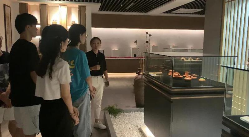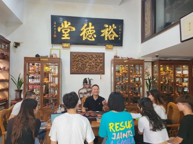 为了进一步了解手拉壶发展现状,队员们拜访了手拉壶知名企业“裕德堂”,具体到企业的生产情况和销售模式、范围、价格、利润,我们从该企业有所了解。佘女士为队员详细介绍展厅每一把各具特色的手拉壶,其中的创造灵感和文化典故令人不禁感慨赞叹大师的匠心独运。