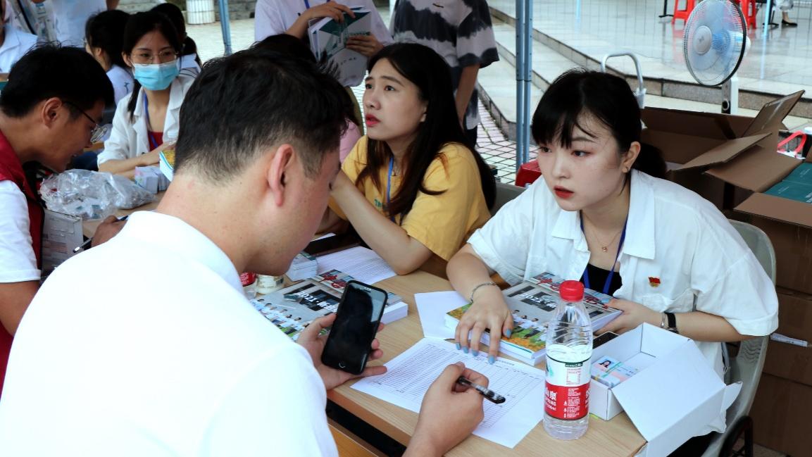 迎新工作人员热情地回答学生问题