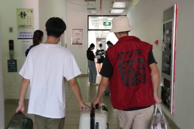 21级中外法学辅导员王孝生老师、团员干部、班助以及志愿者们早早地在位于32栋旁的大本营,等待着新生来到“法的门前”。他们各司其职,一丝不苟地引领新生办理入学手续,体贴入微地为他们介绍缴费、入住事项等办理事宜,解答着新生的问题,回应着他们对大学的期待。辅导员王孝生老师亲临宿舍,关心着同学们将来生活、学习等各个方面的情况,表达着对新生殷切的叮嘱及关怀。