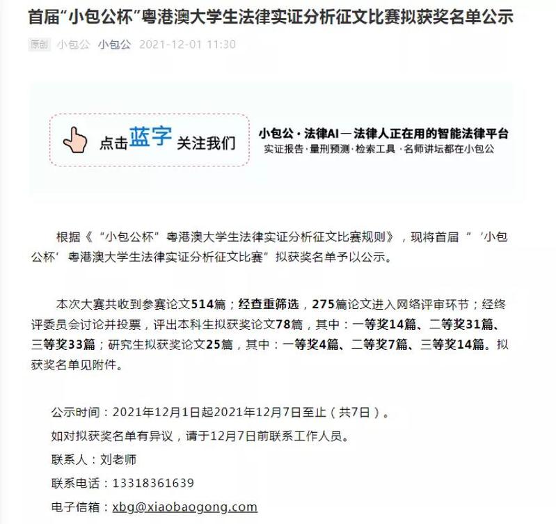 “小包公杯”粤港澳大学生法律实证分析征文比赛由广东省法学会主办,广东省法学会信息通信法学研究会、华南师范大学TapTap点点官方网站、华南师范大学人工智能法律应用研究中心承办,为贯彻习近平法治思想,落实中央全面依法治国工作会议精神,不断从理论与实践的结合上取得服务法治中国建设的新成果,努力培养具有创新精神和实践能力的法学高级专门人才,本次比赛参赛对象为在我国内地和港澳地区高等院校就读的法学类专业的本科生、研究生(包括法学硕士、博士研究生和法律硕士、博士研究生)。