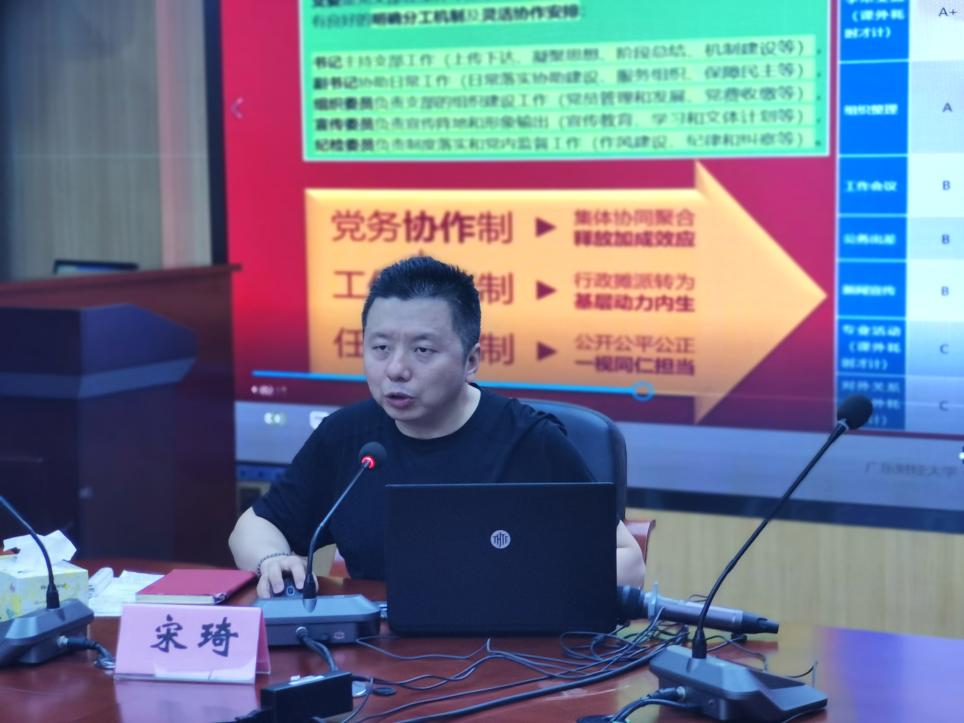 随后,“全国党建工作样板支部”书记宋琦同志就党建工作经验进行了主题分享,宋琦同志作为教育部首批“全国党建工作样板支部”书记,广东省首批新时代高校党建“双创”样板党支部书记,广东省首批高校 “双带头人” 教师党支部书记工作室主持人。宋琦从党支部的建设工作入手,分别介绍了党支部概况、工作和成效以及工作亮点,重点强调了支部工作的建设措施,包括管理监督党员有力、教育党员有力、组织师生有力、凝聚师生有力、宣传师生有力、服务师生有力。通过这些强有力的措施使支部工作由虚变实,创新机制保障落实,党建业务真正融合。