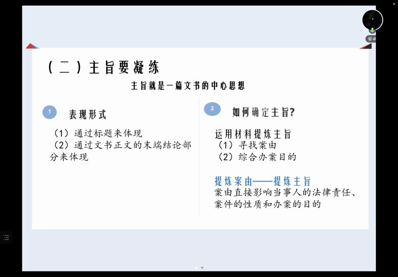 第二部分,文书写作之三大纪律。首先,文书结构要固定,以裁判文书的结构为例说明了遵循法定格式的重要性;其次,主旨要凝练,主要通过标题或者文书正文的末端结论部分两个方面来体现,且需要通过寻找案由和综合办案目的的方式提炼主旨;最后,表述要规范,包括有关引用法律条款的规范、计量单位、标点符号的规范以及文书校对的规范。