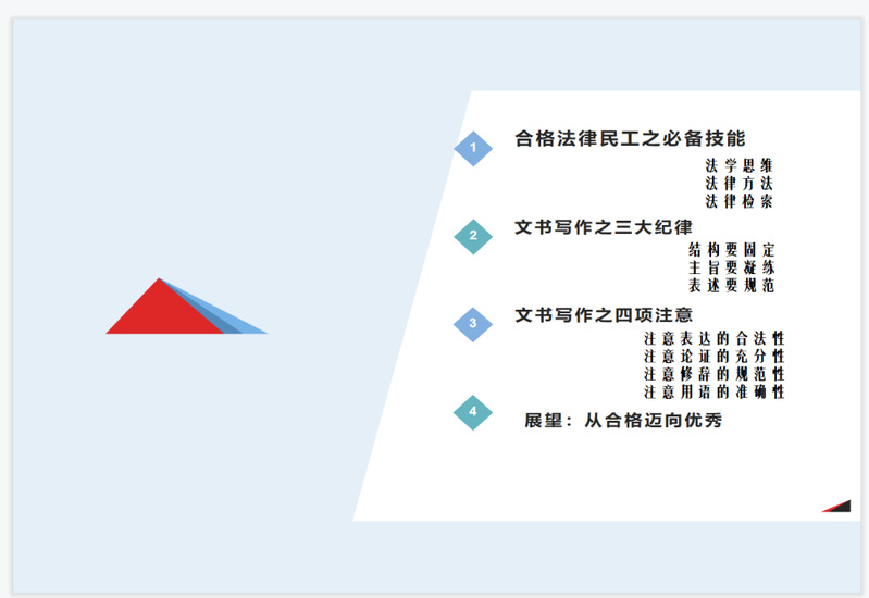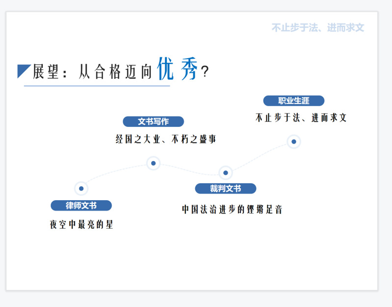第四部分,展望。文书写作是经国之大业,不朽之盛事,法律职业共同体有着更艰巨的“时代使命”,更辽阔的“诗和远方”。以文济法才是良策,鼓励同学们在文书写时,不止步于法,进而求文,集法理、情理、事理、文理于一体,从而创造出理辞通畅、文法俱佳的锦绣文章。在未来的职场、学场中,继续苦心修炼法律思维、学习法律方法、精通法律检索。通过文书写作,为社会贡献价值、守护良知、坚守正义,从合格走向优秀。