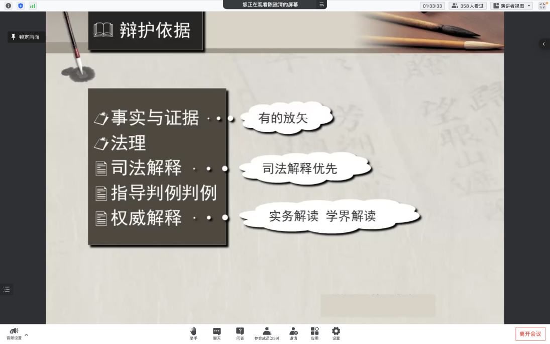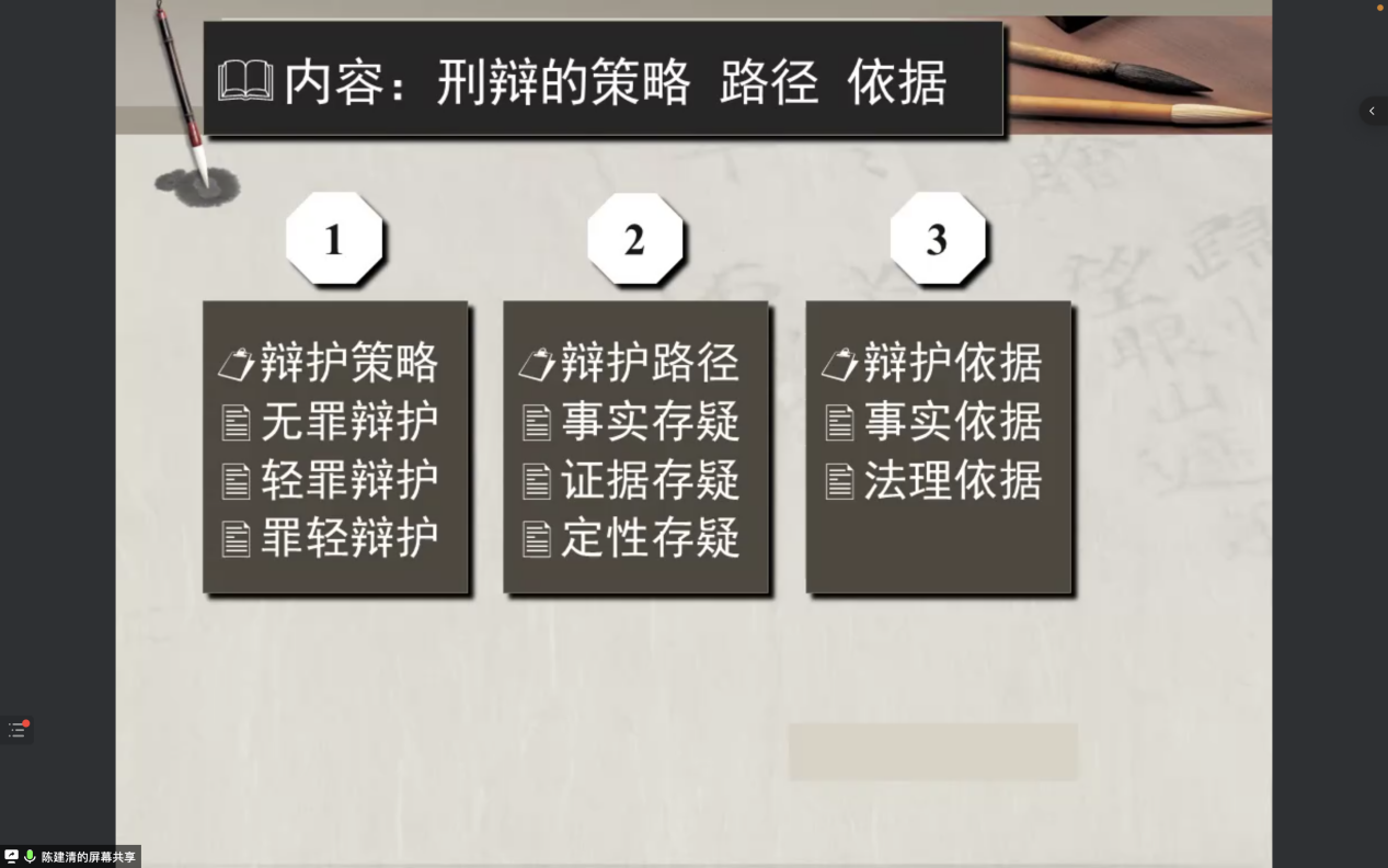 针对辩护依据,陈教授认为应包含事实依据和法理依据,其中法理依据包括司法解释、指导判例判例和权威解释。