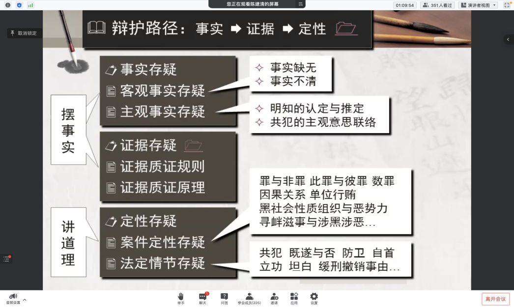 针对辩护路径,陈教授从事实存疑、证据存疑和定性存疑三个角度进行分析。其中,对于事实存疑案件,包含客观事实存疑和主观事实存疑;对于证据存疑案件,包含证据质证规则和证据质证原理;对于定性存疑案件,包含案件定性存疑和法定情节存疑。