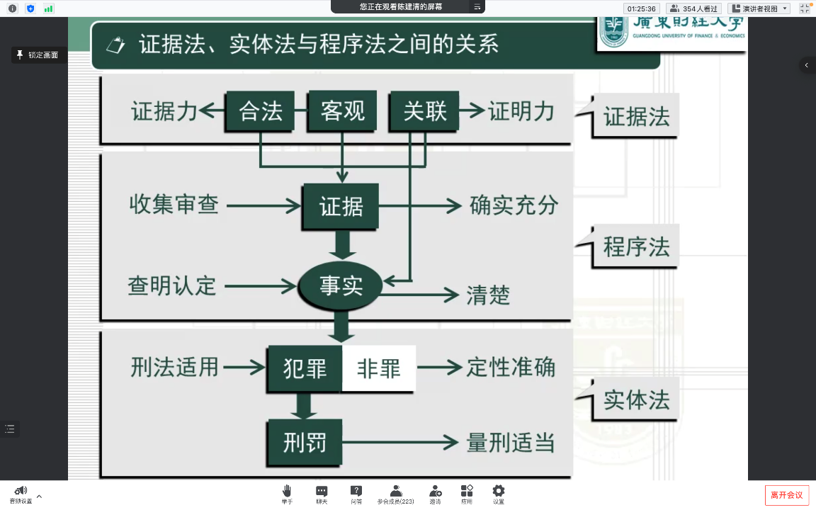 第三,证据法、实体法与程序法之间的关系。对于证据法、实体法与程序法之间的关系,陈教授进行了生动形象的举例。如果把证据法比作食材,那程序法就是烹饪的过程,而实体法就是做出来的菜品。具体而言,证据法将判断证据的合法性、客观性和关联性后为证据的证明力提供标准;程序法通过收集审查证据查明认清事实,为实体法判断罪与非罪提供标准,为量刑提供依据。