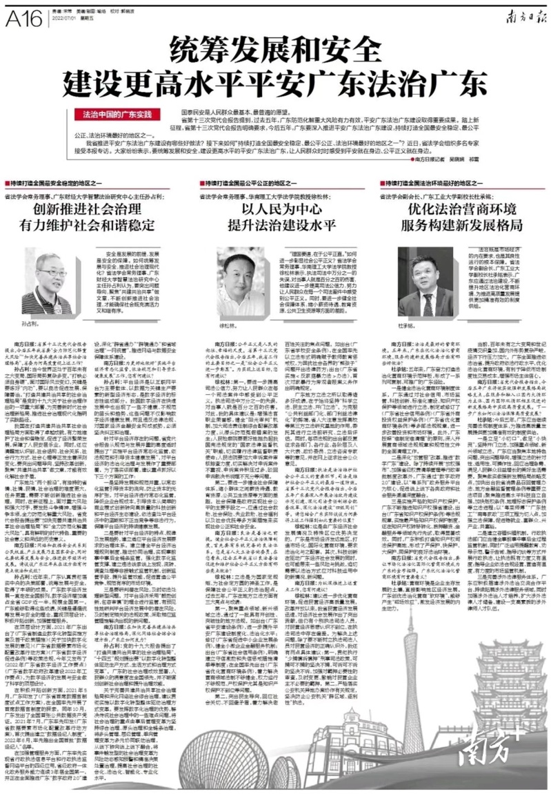 我省推进平安广东法治广东建设有哪些好做法?接下来如何“持续打造全国最安全稳定、最公平公正、法治环境最好的地区之一”?近日,省法学会组织多名专家接受本报专访。大家纷纷表示,要统筹发展和安全,建设更高水平的平安广东法治广东,让人民群众时时感受到平安就在身边、公平正义就在身边。