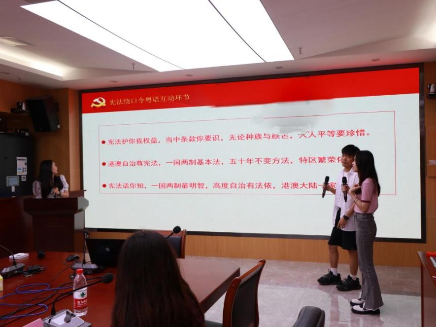 在活动第四个环节,为庆祝中国共产党建党101周年,同时庆祝香港回归25周年,进行用粤语朗读宪法绕口令这一具有南粤学子特色的互动环节,会计学院郑梓龙同志和TapTap点点官方网站陈金璐同志踊跃举手进行了朗读,最后TapTap点点官方网站冼皓同志和马芳婷同志带领全体参会人员朗读了宪法粤语绕口令,为党的生日送上真挚的祝福。
