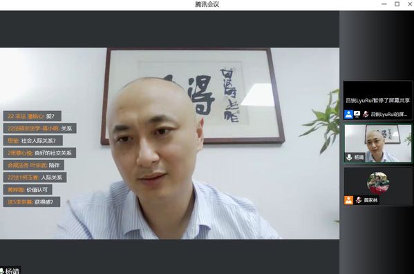 接着,杨靖老师通过与同学互动,从归属感和价值感对大学期间的人际交往的重要性进行了阐述。并指出,此次封控,不失为同学们提升社交能力的一次机会。此外,杨靖老师还给出一些交友建议:一要互相尊重;二要有边界感;三要换位思考。