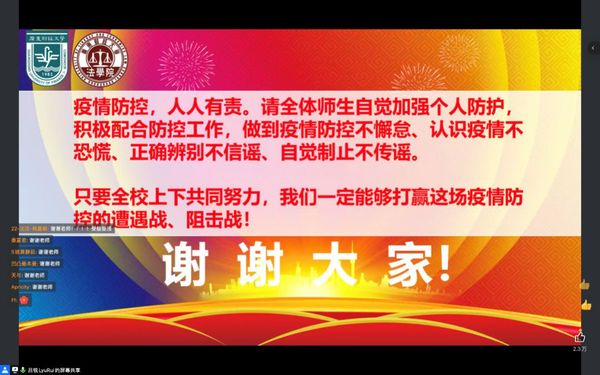 最后,辅导员吕锐向大家号召疫情防控,人人有责。请全体师生加强个人防护,积极配合防控工作,做到疫情防控不懈怠、认识疫情不恐慌、正确辨别不信谣、自觉制止不传谣。只要全校上下共同努力,我们一定能够打赢这场疫情防控的遭遇战、阻击战!