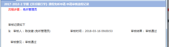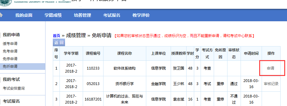 注意:填好免听理由后,一定要点击送审,才能把免听申请提交给教务处进行审核。一个学期免听的课程累计不得超过3门,所以学生只能提交三门课程免听申请。