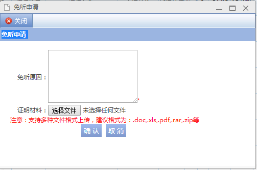 注意:免听原因为必填项,重修的课程不需要上传证明材料;绩点达到3.0申请选修课免听,建议上传一张个人学期成绩单,用于与系统的绩点核对。