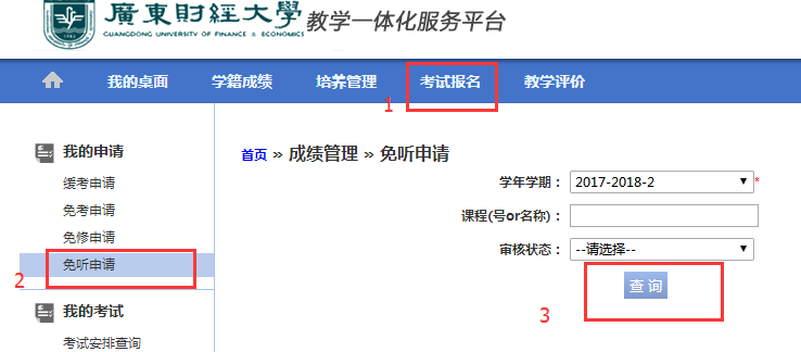 1、学生登录教务系统—考试报名—免听申请,选择学年学期查询。