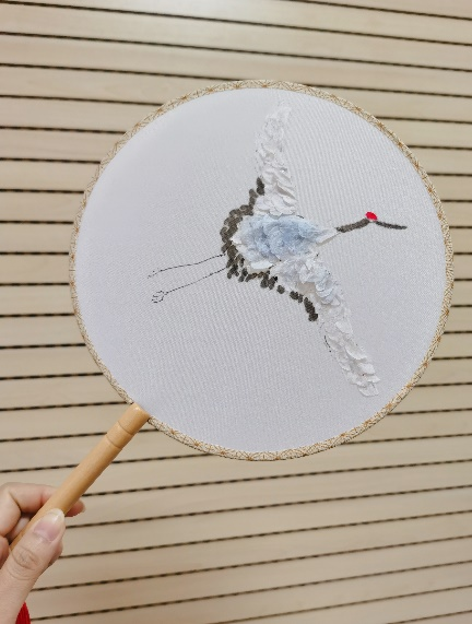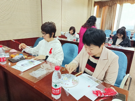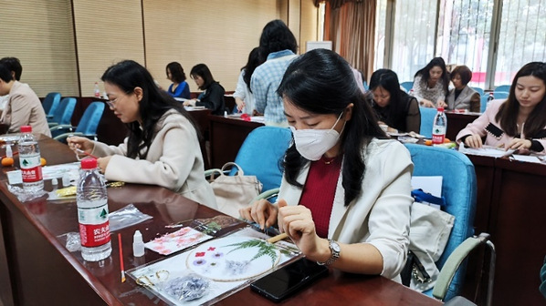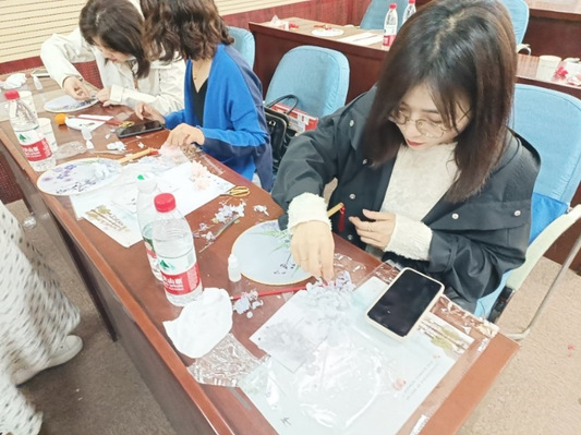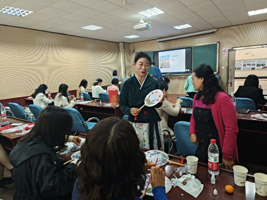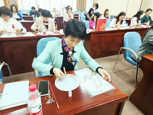 活动过程中,女老师们充分发挥想象力和创造力,精巧构思,调整花材位置,相互交流借鉴。不一会儿,大家就创造出了一个个清新淡雅、形态优美的团扇作品。大家相互欣赏,充分享受动手DIY的乐趣,活动氛围融洽。