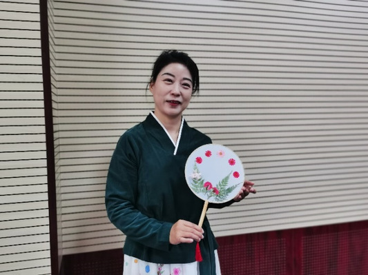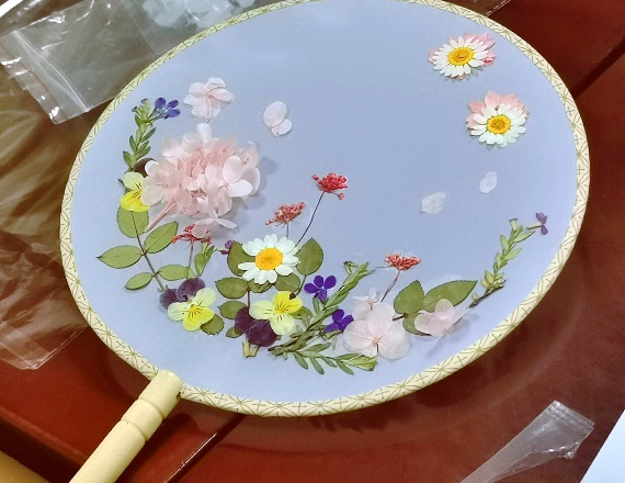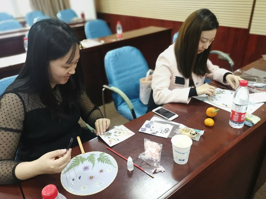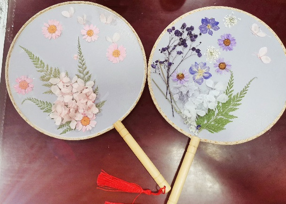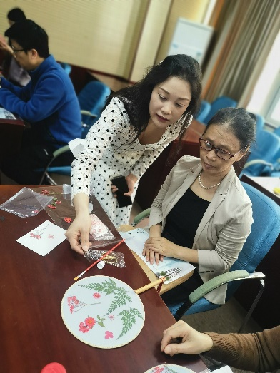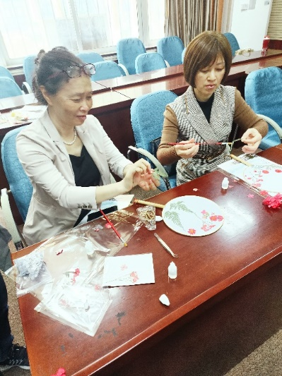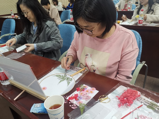 活动现场,学院分工会聘请了公司专业培训师。首先,培训师向各位老师介绍了团扇的文化及寓意,接着细心指导各位老师如何固定花瓣、安放干花、造型插花等。女教师们一边聆听培训师的讲解,一边拿着镊子和剪刀、干花纷纷尝试。
