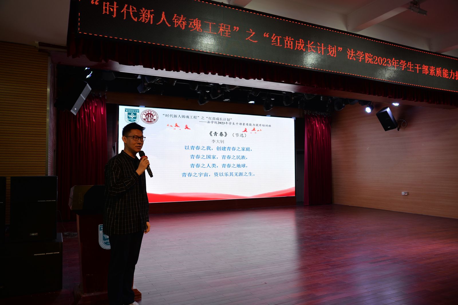 学工部副部长黄洁娜代表党委学生工作部对本次开班仪式的顺利举行表示衷心的祝贺。她结合学生工作实际,赞许了TapTap点点官方网站用实践与创新培养了一代代优秀的广财人用自己的奋斗“擦亮”广财法学的招牌。她提到许多广财优秀校友把自己的理想与追求融入国家的发展,激励并引导全体团学干部紧跟党的步伐、自觉担当尽责、争当新时代追梦者。同时她建议全体团学干部自觉从同学们中来,回到学生们中去,结合同学实际,积极为校园建设献言献策。最后,她衷心的祝愿全体团委学生会干部可以做到“青春在奉献中闪光,理想在拼搏中飞扬”。