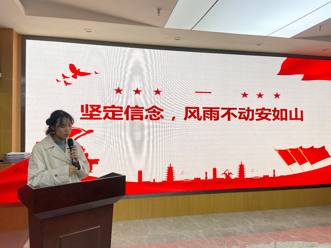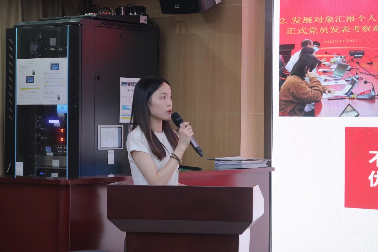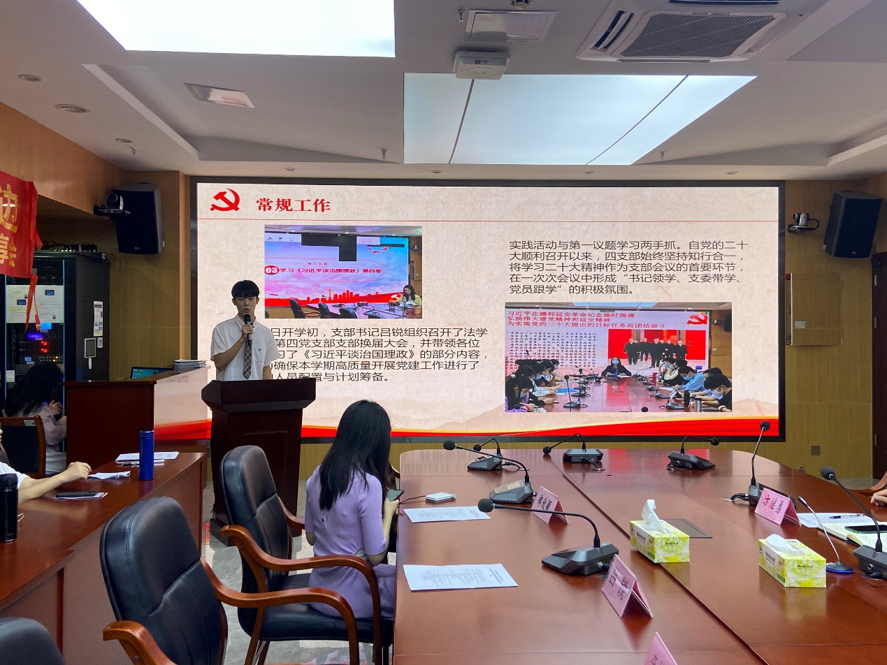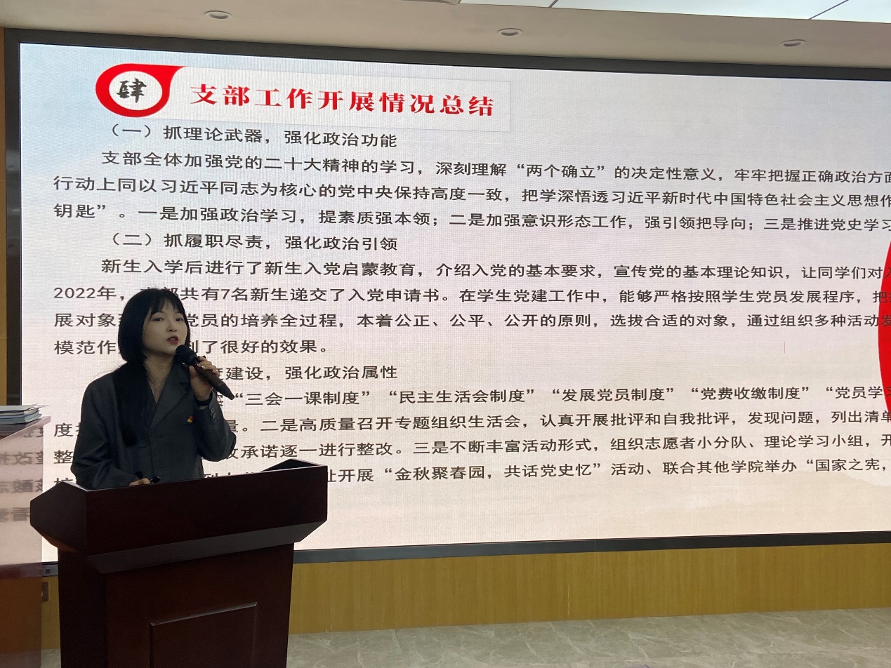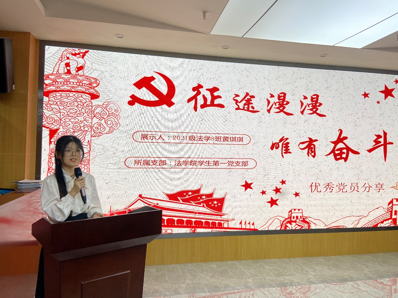 来自宪法学与行政法学、法理学专业研究生党支部的优秀党员贺誉洁以“红心向党,奋进新征程”为题,从党性、表率、学习三个方面进行分享,号召学生党员深入学习贯彻党的二十大精神,坚定理想信念、坚守初心使命,勇做先锋模范,在思想上、行动上都做出表率。