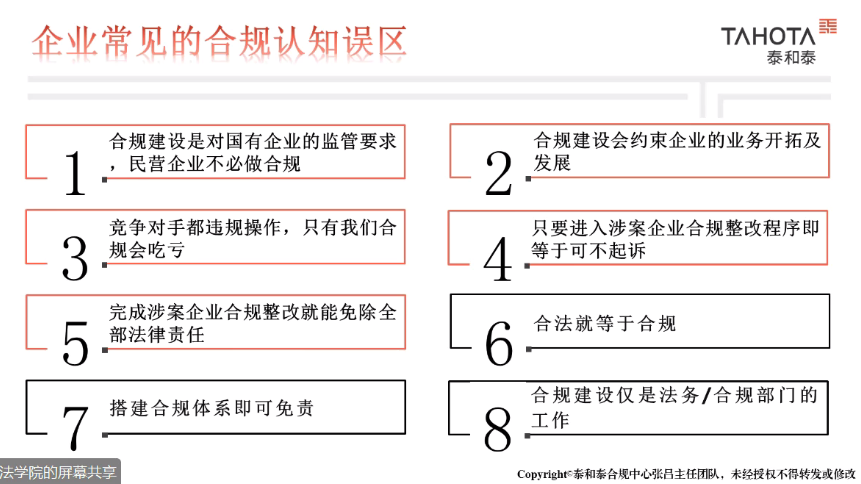 合规管理一定不能离开企业,但是企业中存在许多关于合规的认知误区,常见的有图示八种误区,张吕主任对其进行了详细的分析,说明了每个误区产生的原因以及可能带来的危害,一一打破企业合规认知误区,明确加强企业合规管理的目的是为了保障企业的可持续发展。