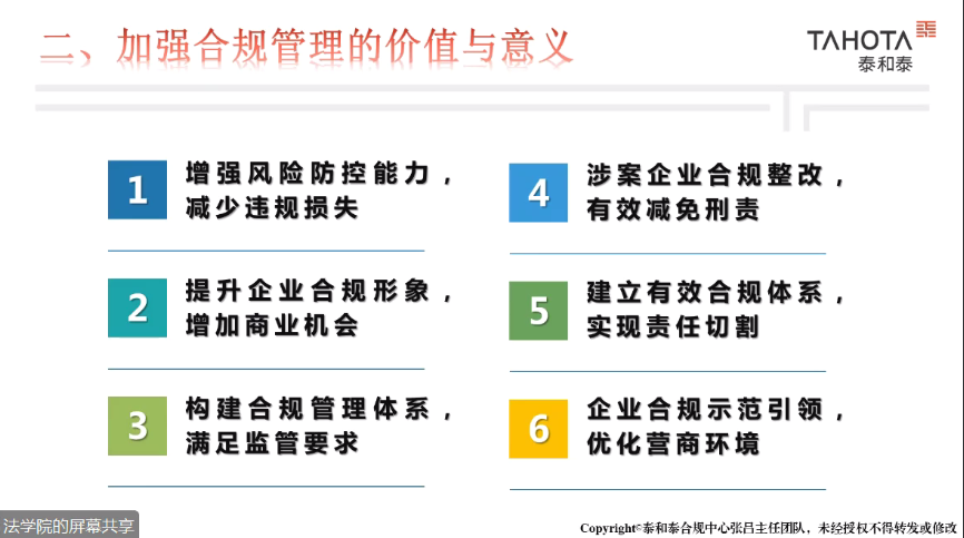 其次,张吕主任还援引“中信银行上海虹口支行泄露个人信息事件”、“直播一姐薇娅偷税漏税遭全网封杀”、“世界五百强企业(民营)——恒大、雪松双双暴雷”、“中国合规无罪辩护第一案——雀巢公司员工侵犯公民个人信息事件”等案例论述做好企业合规管理工作的六大价值和意义,包括:(1)增强风险防控能力,减少违规损失;(2)提升企业合规形象,增加商业机会;(3)构建合规管理体系,满足监管要求;(4)涉案企业合规整改,有效减免刑责;(5)建立有效合规体系,实现责任切割;(6)企业合规示范引领,优化营商环境。并且说明不是所有的违规行为都有改过自新的机会,要把合规管理重心前移,做到事前合规,然后才能防患于未然。