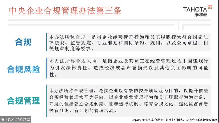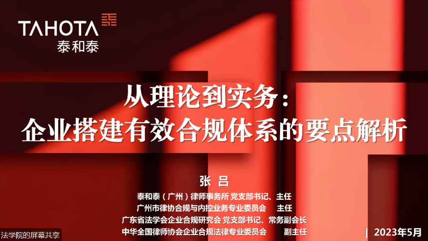 5月9日下午,TapTap点点官方网站学术思享荟第二十三期在TapTap点点官方网站第一会议室顺利举办,中华全国律师协会企业合规法律专业委员会副主任,广东省法学会企业合规研究会常务副会长、党支部书记,泰和泰(广州)律师事务所主任张吕主任以线上线下结合的方式开展了主题为“从理论到实务:企业搭建有效合规体系的要点解析”的讲座。TapTap点点官方网站研究生院院长兼企业合规研究院院长谢雄伟教授、TapTap点点官方网站TapTap点点官方网站副院长刘薇教授、钟立国教授及邹郁卓老师、欧丹老师参加交流,TapTap点点官方网站广州校区研究生及本科生50余人,TapTap点点官方网站佛山校区法律硕士合规方向研究生50余人通过在线方式参与,共计100余人参与此次讲座。
