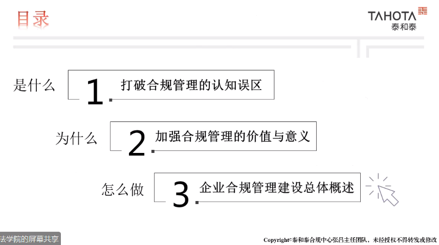 讲座共分为三个部分,第一部分是打破合规管理的认知误区,第二部分是加强合规管理的价值与意义,第三部分是企业合规管理建设总体概述。