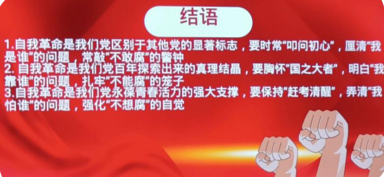 第二部分讲授自我革命是我们党百年探索出来的真理结晶,要胸怀“国之大者”,明白“我靠谁”的问题,扎牢“不能腐”的笼子。党的百年奋斗史,是一部祛病疗伤的自我革命史。从党的八七会议、古田会议到遵义会议,从延安整风运动到十一届三中全会、再到新时代全面从严治党,都是以伟大自我革命精神主动纠正错误,总结经验、完善自我,走向胜利的典范。中国特色社会主义制度的建设最关键在于坚持党的领导,唯有人民是最坚实、最有力的依靠。十八大以来国家持续深入正风肃纪、激浊扬清,作为党员理应常怀自省之心、摒弃非分之想,始终坚守底线,永葆清廉本色。