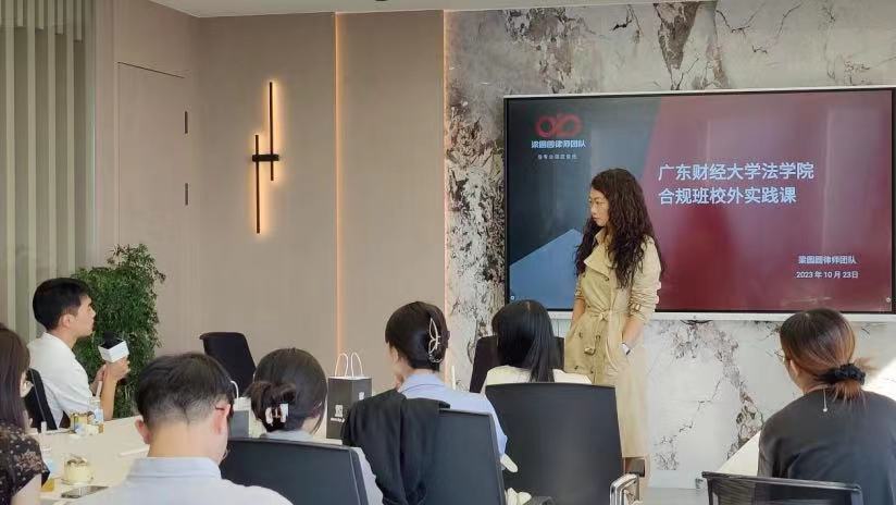 随后,交流会正式开始。梁圆圆律师向全体同学介绍了北京市天元(广州)律师事务所概况及所获荣誉,并围绕合规实务工作心得及团队经办经典案例作专题分享;提问环节,现场交流气氛活跃,同学们积极互动,梁圆圆律师也启发大家以更开放的思维探求多种解决路径。