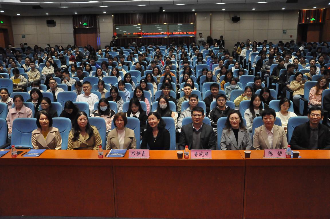 鲁晓明代表学院对石静霞教授的到来表示热烈欢迎,简要介绍了石静霞教授的学术成就与讲座背景,并由陈静书记向石静霞教授献花。