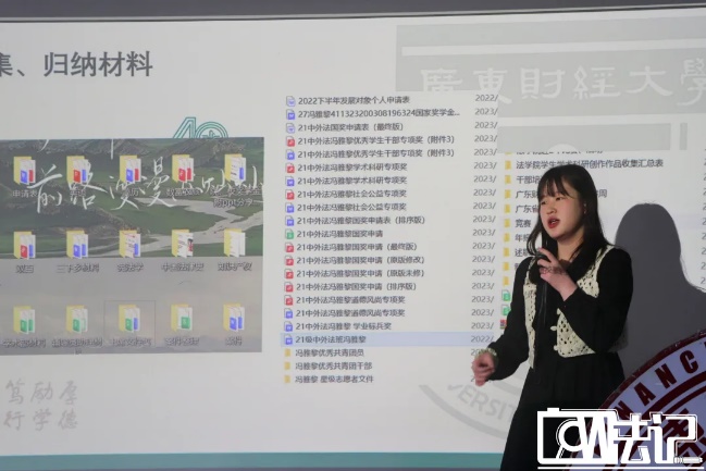 她首先分享了学业成绩及排名、科研项目、学术比赛等方面的相关信息,接着在了解上述信息后如何行动这个方面,她提出要把握不同比赛的时间和要求,还要学会日常规划,如整体的学期规划、详细的每周规划,以及要学会收集与归纳,将工作材料与个人材料区分开来,并重点强调了劳逸结合的重要性。